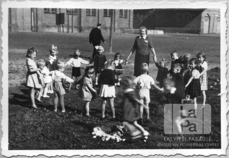Bērnudārza bērni ar vadītāju iet rotaļā svētdienas skolas svētkos Čērčila nometnē (Lībekā). Visi stāv aplī, sadevušies rokās. Fonā vīrietis iet pa plašu laukumu ar stabu vidū. Laukuma pusē ir divas ķieģeļu mūra ēkas. Aplī kopā ar bērniem ir redzama vadītāja Z. Kalnājs.