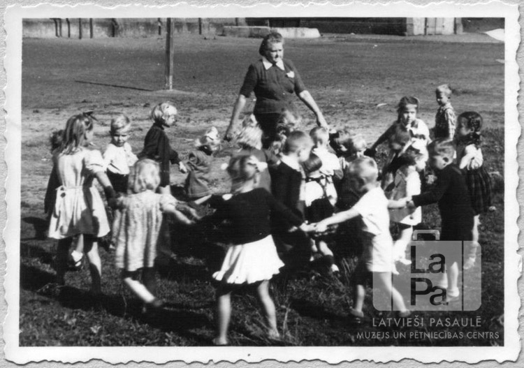 Bērnudārza bērni ar vadītāju iet rotaļā svētdienas skolas svētkos Čērčila nometnē (Lībekā). Visi stāv aplī, sadevušies rokās. Fonā ir plašs laukums ar stabu vidū. Aplī kopā ar bērniem ir redzama vadītāja Z. Kalnājs.