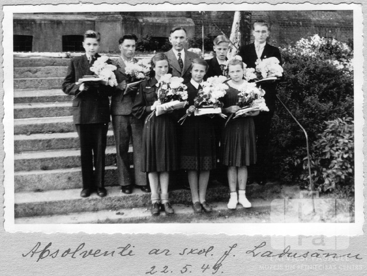 Čērčila nometnes Lībekā (angļu zonā) skolas absolventi ar klases audzinātāju stāv uz ēkas kāpnēm. Skolēniem rokās ir dokumenti un ziedi. Otrajā rindā, trešais no kreisās: J. Ladusāns (pasniedzējs).