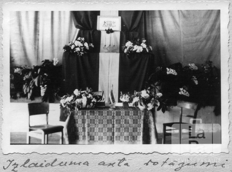 Skolas izlaiduma akta rotājumi Čērčila nometnē Lībekā (angļu zonā). Galds ir apklāts ar rakstainu galdautu, uz tā ir ziedi un mazs Latvijas karogs. Blakus galdam ir divi krēsli. Aiz galda ir Latvijas karogs un ģerbonis.