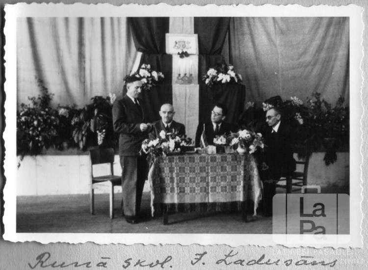 Četri vīrieši pie prezidija galda skolas izlaiduma aktā Čērčila nometnē Lībekā (angļu zonā). Viens vīrietis stāv kājās, trīs sēž. Galds ir apklāts ar rakstainu galdautu, uz tā ir ziedi un mazs Latvijas karogs. Aiz galda ir Latvijas karogs un ģerbonis. Pirmais no kreisās: J. Ladusāns (skolotājs).