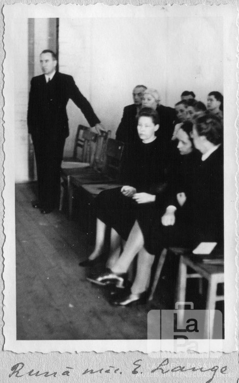 Skolas izlaiduma akta apmeklētāji Čērčila nometnē Lībekā (angļu zonā). Viens vīrietis stāv kājās, pārējie cilvēki sēž uz krēsliem vairākās rindās. Pirmais no kreisās: E. Lange (mācītājs).