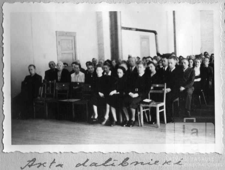 Skolas izlaiduma akta apmeklētāji Čērčila nometnē Lībekā (angļu zonā). Cilvēki telpā sēž uz krēsliem vairākās rindās. Pirmajā rindā, pirmais no kreisās: E. Lange (mācītājs).