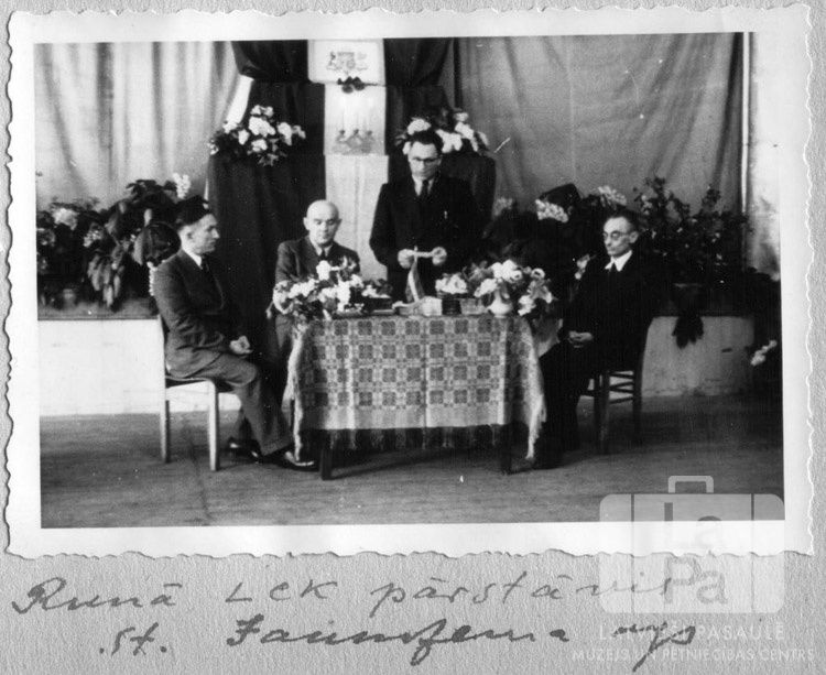 Četri vīrieši pie prezidija galda skolas izlaiduma aktā Čērčila nometnē Lībekā (angļu zonā). Viens vīrietis stāv kājās, trīs sēž. Galds ir apklāts ar rakstainu galdautu, uz tā ir ziedi un mazs Latvijas karogs. Az vīriešiem ir Latvijas karogs un ģerbonis. Trešais no kreisās: St. Jaunzems (LCK pārstāvis).