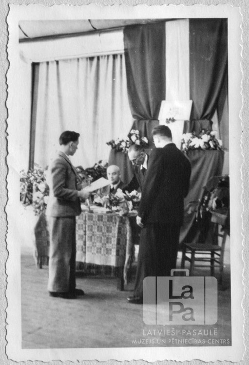 Absolvents saņem gatavības apliecību pie prezidija galda skolas izlaiduma aktā Čērčila nometnē Lībekā (angļu zonā). Priekšā divi cilvēki stāv kājās, aiz galda viens vīrietis sēž, viens stāv kājās. Galds ir apklāts ar rakstainu galdautu, uz tā ir ziedi. Fonā labajā pusē ir Latvijas karogs un ģerbonis.
