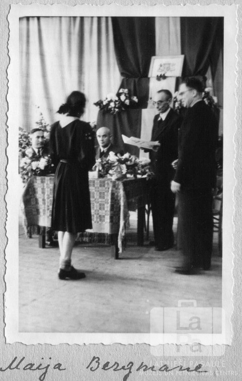 Absolvente saņem gatavības apliecību pie prezidija galda skolas izlaiduma aktā Čērčila nometnē Lībekā (angļu zonā). Galda priekšā skolniece un vīrietis stāv kājās, aiz galda viens vīrietis stāv, divi sēž. Galds ir apklāts ar rakstainu galdautu, uz tā ir ziedi. Fonā labajā pusē ir Latvijas karogs un ģerbonis. Priekšā, pirmā no kreisās: Maija Bergmane.