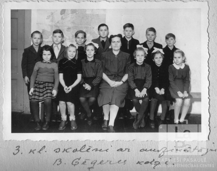 3. klases skolēni ar audzinātāju Čērčila nometnē Lībekā (angļu zonā). Fonā kreisajā pusē ir karte. Pirmajā rindā, ceturtā no kreisās: B. Ģēģere (audzinātāja).