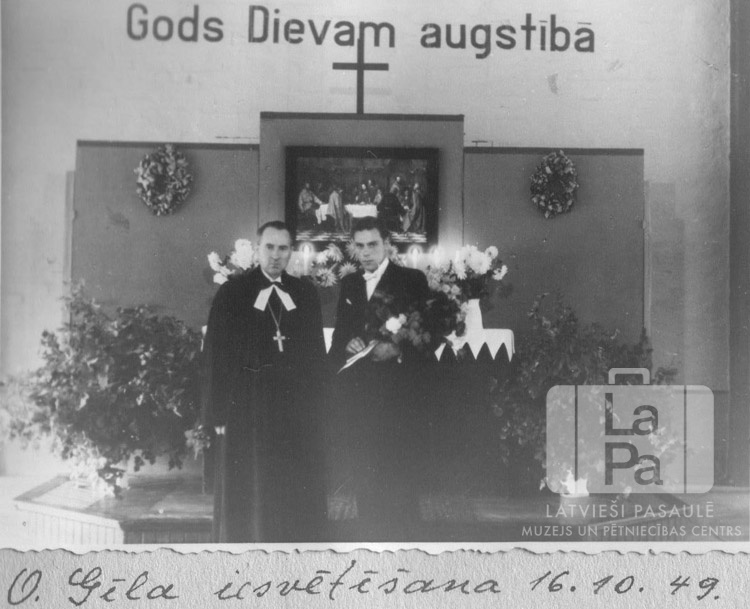 Mācītājs amata tērpā ar iesvētāmo jaunekli pie baznīcas altāra Čērčila nometnē Lībekā (angļu zonā). Jauneklim rokās ir ziedi. Uz altāra ir ziedi vāzēs un aizdegtas sveces. Virs altāra ir glezna, virs tās ir koka krusts un uzraksts "Gods Dievam augstībā". Abpus altārim ir divas lielas vāzes ar meijām. No kreisās: Edgars Lange (mācītājs), O. Gēls (ar ziediem).