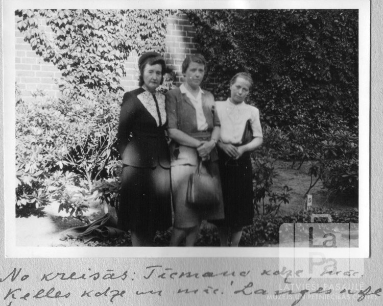 Trīs sievietes pēc kapu svētkiem "Vorwerk" kapsētā Lībekā (angļu zonā). Fonā ir ar vīteņaugiem apaugusi siena. No kreisās: ? Tīcmane, ? Ķelle, Lilija Lange.