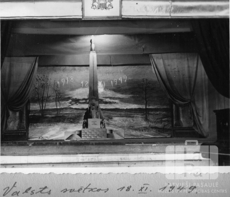 Skatuves iekārtojums Latvijas Valsts svētkos Čērčila nometnē Lībekā (angļu zonā). Priekšplānā, labajā pusē, ir klavieres. Uz skatuves ir Brīvības piemineklis, aiz tā ir uz sienas uzgleznota dabas ainava ar kokiem, zāli, debesīm un skaitļiem "1918", "18 XI" un "1949". Virs skatuves ir Latvijas ģerbonis.