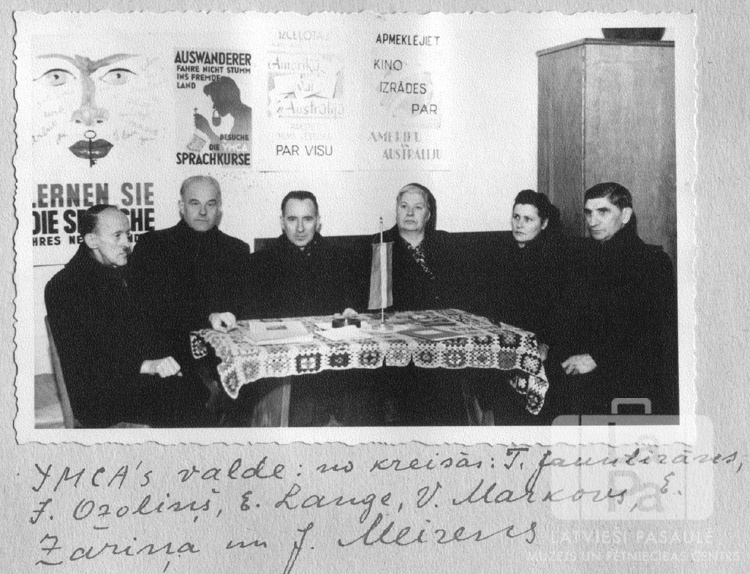Organizācijas "YMCA" valde sēž pie galda Čērčila nometnē Lībekā (angļu zonā). Galds ir apklāts ar rakstainu galdautu, uz tā ir mazs Latvijas karogs. Fonā pie sienas ir plakāti gan vācu, gan latviešu valodā. Ap galdu sēž, no kreisās: T. Jauntirāns, J. Ozoliņš, Ernests Lange, V. Markovs, E. Zariņa un J. Meirens.