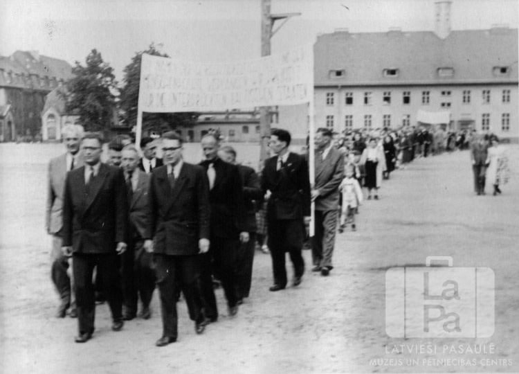 Mēsenes nometnes Lībekā (angļu zonā) protesta gājiens uz dievkalpojumu Aegedi baznīcā ("Aegidienkirche"). Gan gājiena priekšā, gan tā aizmugurē divi cilvēki nes lielus plakātus. Fonā ir plašs laukums, tā malās ir vairākstāvu mūra ēkas.