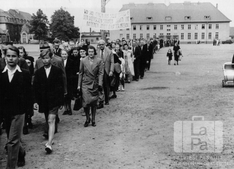 Mēsenes nometnes Lībekā (angļu zonā) protesta gājiens uz dievkalpojumu Aegedi baznīcā ("Aegidienkirche"). Procesija dodas pāri plašam laukumam, kura malās ir vairākas mūra ēkas. Divi cilvēki nes lielu plakātu.