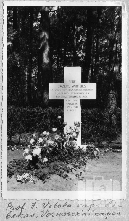 Profesora Jāzepa Vītola kaps "Vorwerk" kapsētā Lībekā (angļu zonā). Uz kapa kopas ir ziedi, tās galā ir gaišs krusts ar J. Vītola dzimšanas un miršanas datiem.