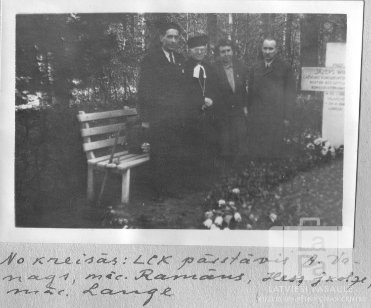 Trīs vīrieši un sieviete pēc svētbrīža pie profesora Jāzepa Vītola kapa "Vorwerk" kapsētā Lībekā (angļu zonā). Labajā pusē ir gaišs kapa krusts. Aizmugurē ir koka solas, fonā ir mežs. No kreisās: A. Vanags (LCK pārstāvis), ? Ramāns (mācītāja amata tērpā), ? Hess un Ernests Lange (mācītājs).