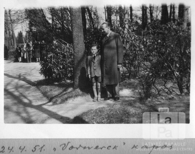 Mācītājs Edgars Lange ar dēlu Andri pēc svētbrīža pie profesora Jāzepa Vītola kapa "Vorwerk" kapsētā Lībekā (angļu zonā). Fonā kreisajā pusē ir redzama cilvēku grupa. Apkārt aug mežs. Priekšā, no kreisās: Andris Lange, Ernests Lange.