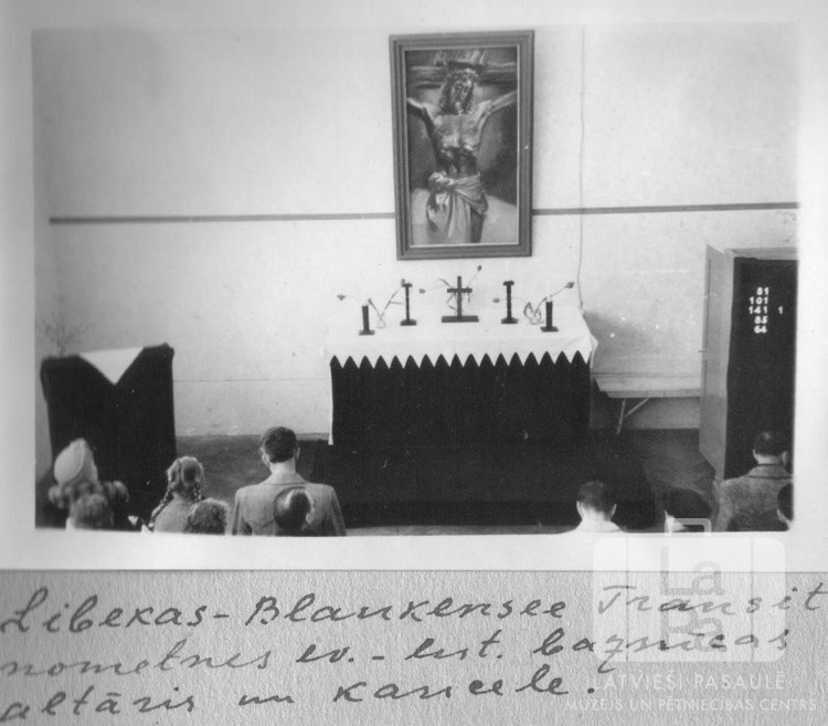 Evaņģēliski luteriskās baznīcas iekšpuse Blankenzē nometnē Lībekā (angļu zonā). Skats ir no augšas, priekšplānā ir redzamas apmeklētāju galvas un muguras. Kreisajā pusē, telpas stūrī, ir kancele. Vidū ir altāris ar svečturiem, virs tā ir glezna.