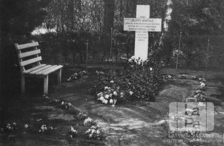 Profesora Jāzepa Vītola kaps "Vorwerk" kapsētā Lībekā (angļu zonā). Kreisajā pusē ir gaišs koka sols, vidū kapa kopa ar gaišu krustu tā galā. Fonā ir dzīvžogs, aiz tā mežs.