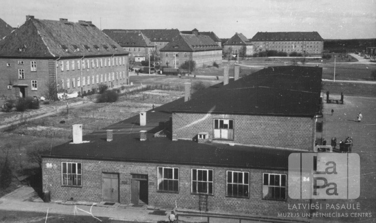 Skats no augšas uz vairākstāvu mūra ēkām Ventorfas nometnē (angļu zonā). Pa vidu ēkām ir pagalms un plašs laukums. Gar ēkām staigā cilvēki. Priekšplānā, zemās ēkas tālajā galā, bija iekārtota nometnes baznīca. Redzama ir tikai daļa no nomentes ēkām.
