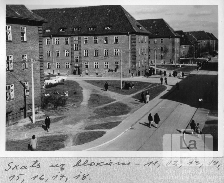 Skats uz vairākstāvu dzīvojamajām ēkām un ielu Ventorfas nometnē (angļu zonā). Redzamo ēku bloku numuri: 11, 12, 13, 14, 15, 16, 17 un 18. Pa ielu un pāri pagalmiem pastaigājas cilvēki.