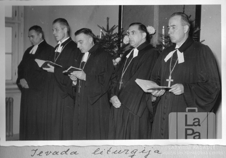 Ekumēniskā dievkalpojuma ievada liturģija piecu mācītāju izpildījumā Ventorfas nometnē (angļu zonā). Mācītāji ir ģērbušies amata tērpos, trim rokās ir grāmatas. Aizmugurē ir devas zemas egles, aizdegtas sveces un baznīcas altārglezna. No kreisās: ? Dilys (lietuvietis), ? Vaharo (igaunis), ? Meisters (latvietis), ? Vēdzele (latvietis), Edgars Lange (latvietis).