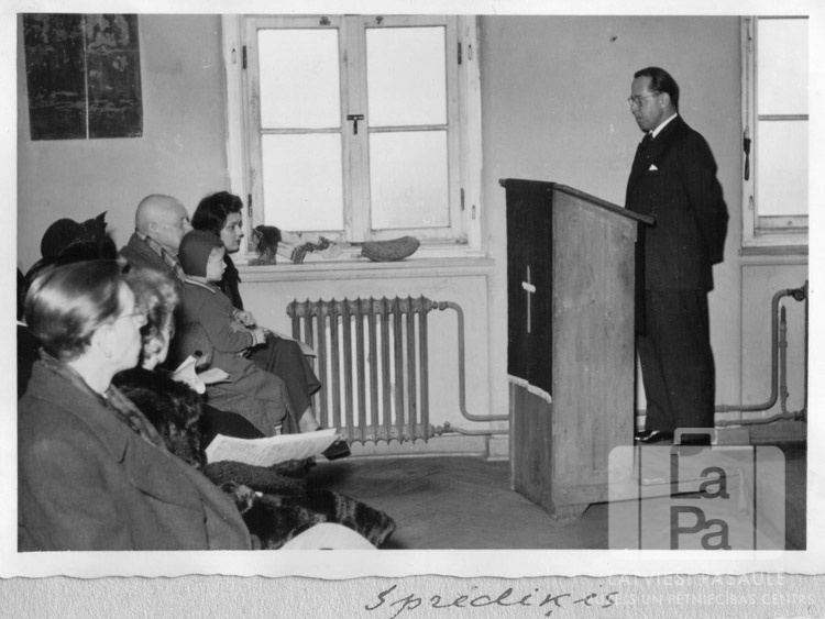 Mācītājs ? Christiansens (dānis) sprediķo ekumēniskajā dievkalpojumā Ventorfas nometnē (angļu zonā). Vīrietis stāv labajā pusē pie kanceles. Kreisajā pusē uz krēsliem sēž klausītāji – baznīcas draudze. Fonā divi telpas logi.