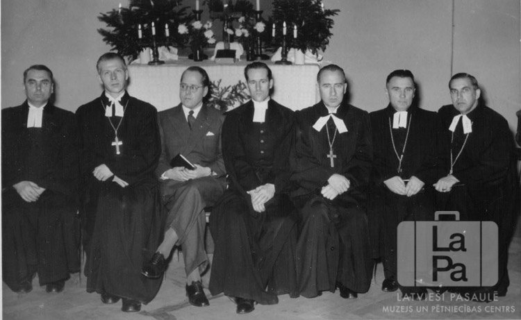 Ekumēniskā dievkalpojuma mācītāji Ventorfas nometnē (angļu zonā). Septiņi mācītāji sēž vienā rindā. Seši vīrieši ir ģērbušies mācītāja amata tērpos. Fonā ir altāris ar aizdegtām svecēm svečturos, ziediem un nelielām eglēm, kuru zaros ir saspraustas aizdegtas sveces. No kreisās: ? Dilys (lietuvietis), ? Vaharo (igaunis), ? Christiansens (dānis), ? Thölin (zviedrs), Edgars Lange (latvietis), ? Meisters (latvietis), ? Vēdzele (latvietis).