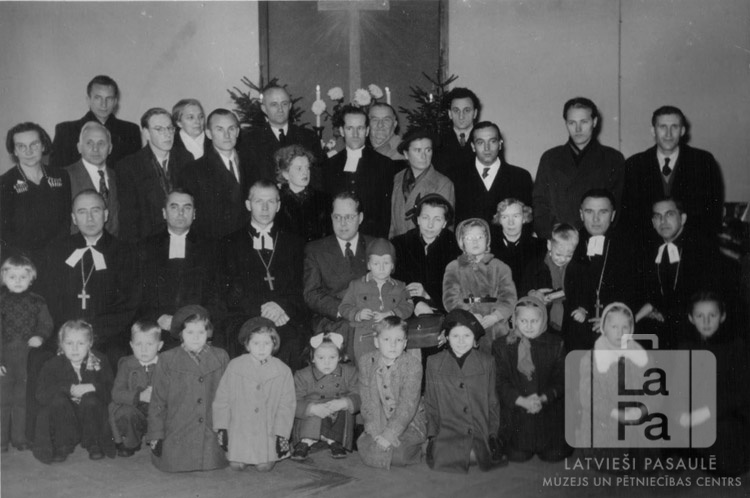 Ekumēniskā dievkalpojuma dalībnieki – viesu grupa ar draudžu darbiniekiem Ventorfas nometnē (angļu zonā). Viņu vidū ir redzami vairāki mācītāji amata tērpos. Priekšā uz grīdas sēž bērni. Fonā ir altāris ar ziediem un nelielām eglēm, kuru zaros ir saspraustas aizdegtas sveces. Virs altāra ir altārglezna. Otrajā rindā sēž mācītāji tērpos, no kreisās: ? Dilys (lietuvietis), ? Vaharo (igaunis), ? Christiansens (dānis, ģērbies uzvalkā). Otrajā rindā sēž mācītāji tērpos, no labās: pirmais ? Vēdzele (latvietis), otrais ? Meisters (latvietis). Trešajā rindā, sestais no kreisās: mācītājs ? Thölin (zviedrs, amata tērpā). Pēdējā rindā, otrā no kreisās: Alīde Zariņa (ar gaišu šalli).
