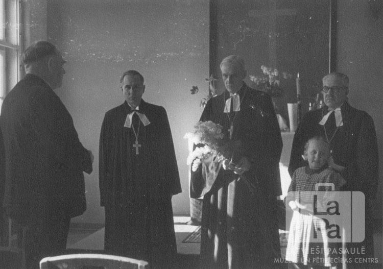 Skolotājs Rozītis saka atvadu vārdus profesoram Kārlim Kundziņam viņa atvadīšanās pasākumā Ventorfas nometnē (angļu zonā). Abpus profesoram stāv divi vīrieši, visi trīs ir ģērbušies mācītāja amata tērpā. Priekšā, labajā pusē, stāv maza meitene rūtainā kleitā. Fonā ir baznīcas altāris ar aizdegtām svecēm, ziediem vāzēs un altārgleznu ar krustu. No kreisās: pirmais ? Rozītis, otrais Edgars Lange, trešais Kārlis Kundziņš (ar ziediem rokās).