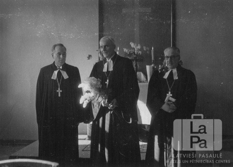 Trīs mācītāji pie altāra profesora Kārļa Kundziņa atvadīšanās pasākumā Ventorfas nometnē (angļu zonā). Visi trīs ir ģērbušies mācītāja amata tērpā. Fonā ir baznīcas altāris ar aizdegtām svecēm, ziediem vāzēs un altārgleznu ar krustu. No kreisās: Edgars Lange, Kārlis Kundziņš (ar ziediem rokās, saka pateicības vārdus), nezināms.