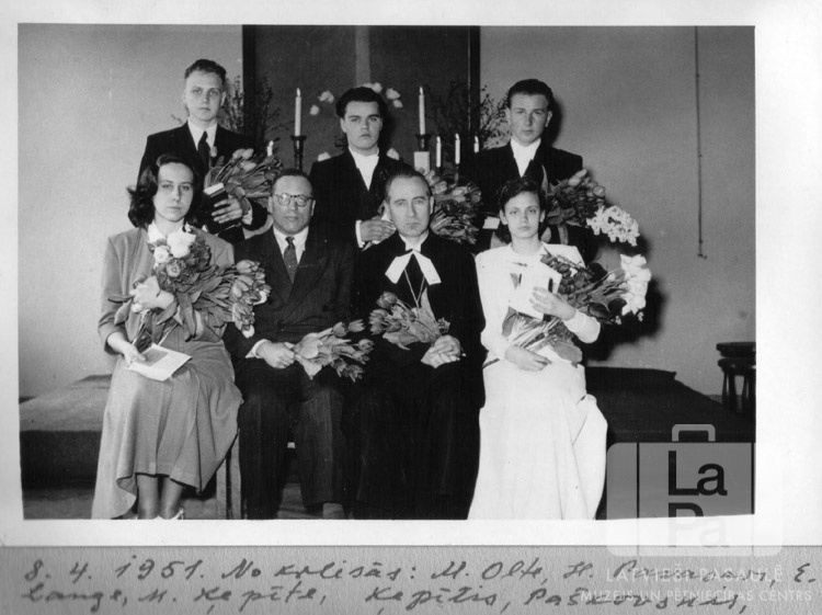 Jaunieši ar mācītājiem iesvētībās Ventorfas nometnē (angļu zonā). Visiem rokās ir ziedi. Fonā ir altāris ar aizdegtām svecēm, virs tā ir altārglezna. Pirmajā rindā, no kreisās: M. Olte, H. Pavasars, Edgars Lange (mācītājs), M. Ķepīte. Otrajā rindā, no kreisās: I. Ķepītis, ? Paškovskis, nezināms.