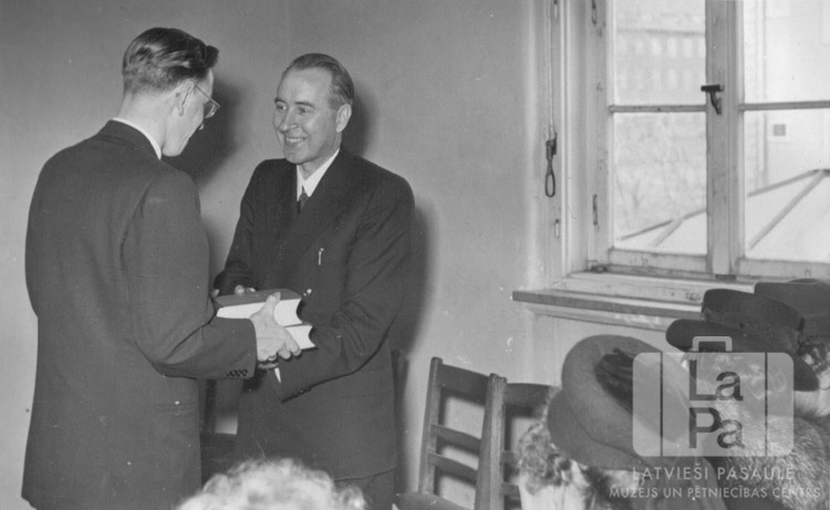Mācītājs Edgars Lange saņem atvadu dāvanu draudzes darbinieku atvadīšanās pasākumā Ventorfas nometnē (angļu zonā). Viņam blakus stāv vīrietis, priekšplānā uz krēsliem sēž vēl vairāki cilvēki. Labajā pusē ir logs. Otrais no kreisās: Edgars Lange (saņem grāmatas).
