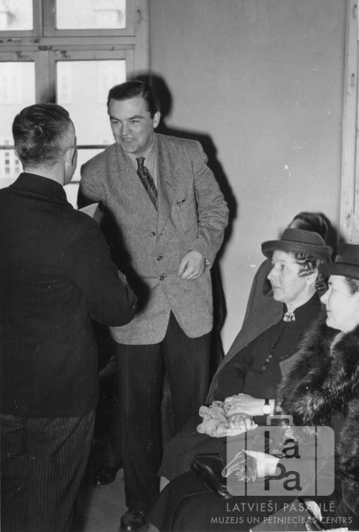 Dr. J. Kļaviņš saņem atvadu dāvanu draudzes darbinieku atvadīšanās pasākumā Ventorfas nometnē (angļu zonā). Viņam blakus stāv vīrietis, priekšplānā uz krēsliem sēž vēl vairāki cilvēki. Fonā kreisajā pusē ir logs. Pirmais no kreisās: J. Kļaviņš.