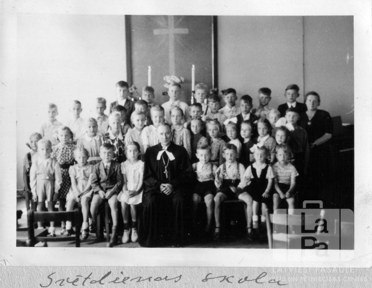 Svētdienas skolas bērni ar mācītāju K. Gundersena atvadīšanās pasākumā Ventorfas nometnē (angļu zonā). Fonā ir altāris ir divām aizdegtām svecēm un altārglezna ar krustu. Pirmajā rindā, piektais no kreisās: Edgars Lange (mācītājs amata tērpā).