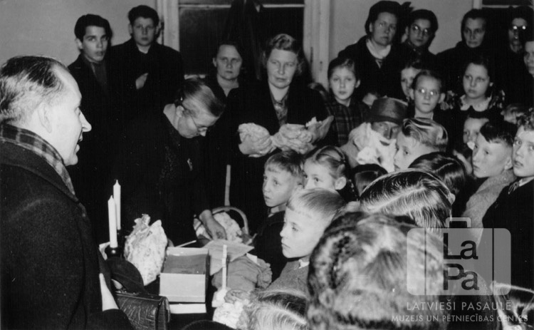 Bērni un pieaugušie Ziemassvētku pasākumā Ventorfa nometnē (angļu zonā), ap 1950. gadu. Grupas vidū ir redzamas dāvanas, labajā pusē grupā ir Ziemassvētku vecītis ar gaišu bārdu. Fonā ir divi logi. Priekšā, pirmais no kreisās: Edgars Lange (mācītājs).