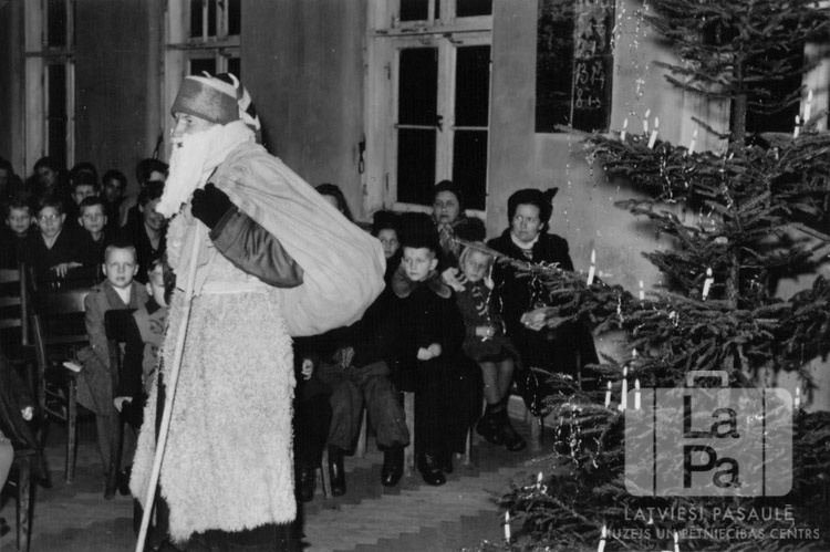 Ziemassvētku vecītis pie svētku egles Ziemassvētku pasākumā Ventorfa nometnē (angļu zonā), ap 1950. gadu. Vīrietis ir ģērbies gaišā mētelī ar spieķi rokās, cepuri galvā un dāvanu maisu pār plecu. Labajā pusē svētku eglē ir sakarināti rotājumi un aizdegtas sveces. Aizmugurē krēslu rindās sēž pasākuma apmeklētāji – bērni un pieaugušie. Fonā ir trīs telpas logi.