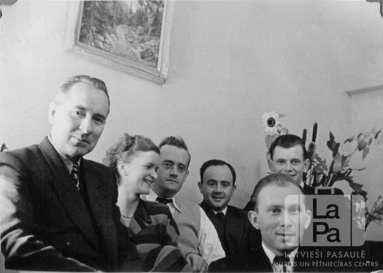 Maza cilvēku grupa atvadīšanās pasākumā no Mr. un Mrs. Griswold Hamburgā (angļu zonā). Kreisajā pusē pie sienas karājas glezna ar skujkoku attēlu, labajā pusē aiz grupas ir augu kompozīcija ar saulespuķi, vilkvālēm u.c. augiem. Pirmais no kreisās: Edgars Lange (mācītājs).