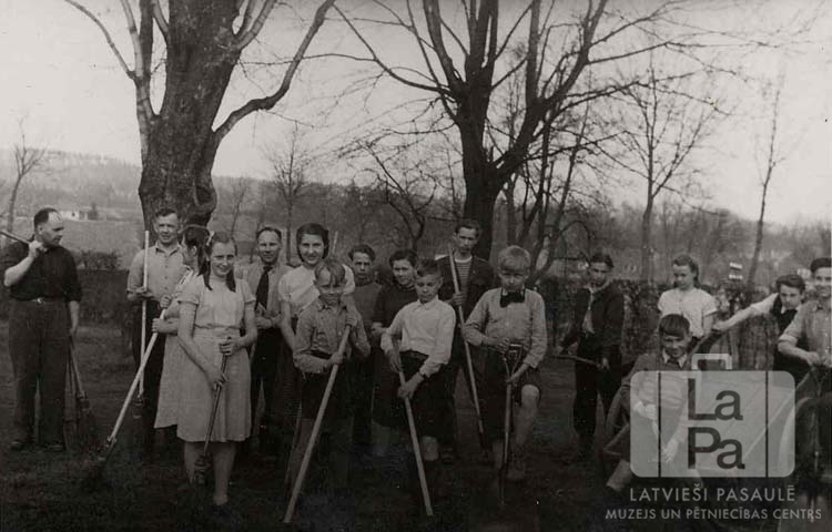 Skolēni pavasara talkā Baireitas nometnē (amerikāņu zonā) 1949. gada pavasarī. Kreisajā pusē ir redzami trīs vīrieši. Visiem cilvēkiem rokās ir lāpstas un slotas, labajā pusē ir nelieli rati. Fonā koki bez lapām un tālumā pauguraina ainava.