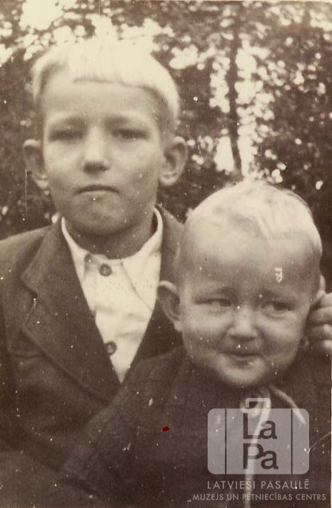Divi Liepiņu ģimenes bērni Volterdingenes nometnē (angļu zonā), ap 1948. gadu. Zēns tur meiteni aiz auss. Fonā ir mežs. No kreisās: Olģerts Liepiņš un Lauma Liepiņa. Foto autors: Jānis Liepiņš.