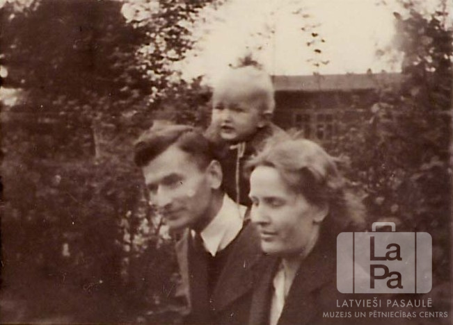 Lauma Liepiņa bērnībā ar vecākiem Volterdingenes nometnē (angļu zonā) ap 1948. gadu. Vīrietis tur mazo meiteni uz pleciem. Fonā caur kokiem ir redzama ēka. No kreisās: Jānis Liepiņš, Lauma Liepiņa un Vallija Liepiņa.