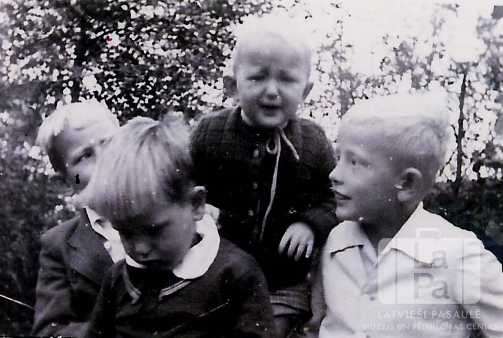 Liepiņu ģimenes bērni Volterdingenē (angļu zonā) ap 1948. gadu. Fonā koki. No kreisās: Olģerts Liepiņš, Jānis Liepiņš, Lauma Liepiņa, Rudolfs Liepiņš. Foto autors: Jānis Liepiņš.
