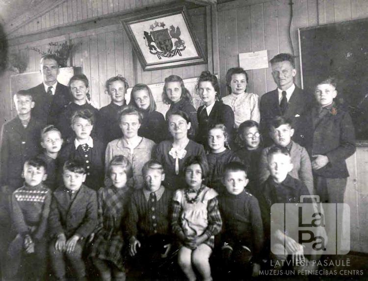 Latviešu pamatskolas skolēni un skolotāji Vīnertas nometnē Hūzumā (angļu zonā) 1945.–1946. mācību gadā. Cilvēku grupa trīs rindās. Fonā, vidū, pie sienas ir Latvijas ģerbonis. Labajā pusē pie sienas ir tāfele.