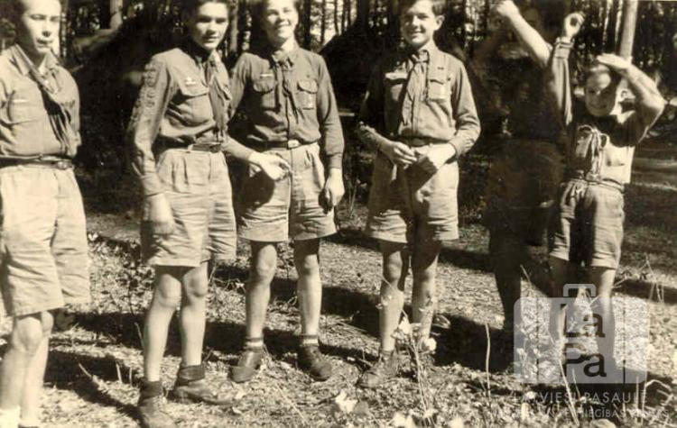 Gaujas 31. skautu vienības skauti no Antverpes nometnes Flensburgā (angļu zonā) "Baden-Powell" nometnes laikā Timmendorfā. Nometne notika no 1948. gada 17. līdz 27. jūlijam. Zēni ir ģērbušies formastērpos. Fonā mežs. No kreisās: Gunārs Freimanis, Pāvils Dunskis, Mintauts Zvirbulis, Leons Gudrais un Uldis Sēja.