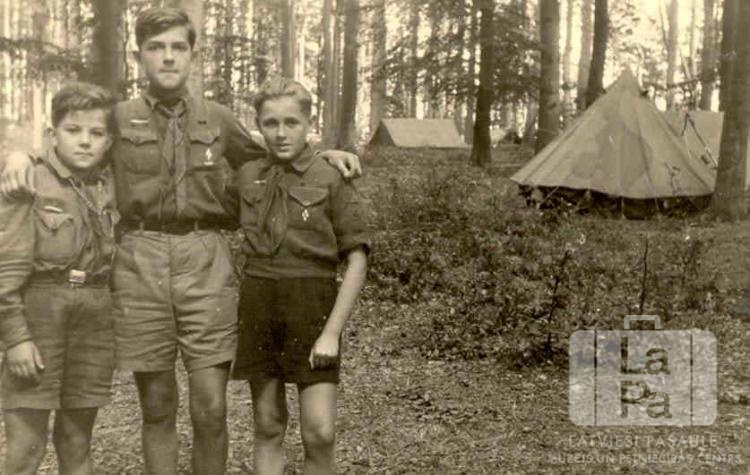 Trīs Gaujas 31. skautu vienības apakškopnieki no Antverpes nometnes Flensburgā (angļu zonā) "Baden-Powell" nometnes laikā Timmendorfā. Nometne notika no 1948. gada 17. līdz 27. jūlijam. Zēni ir ģērbušies formastērpos. Fonā ir teltis mežā. No kreisās: Uldis Sēja, Leons Gudrais un Jānis Ābols.