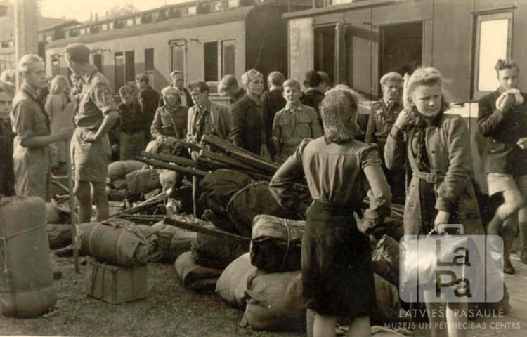 Gaujas 31. skautu un Gaujas 35. gaidu vienības no Antverpes nometnes Flensburgā (angļu zonā) ar mantām un saiņiem stāv pie vilciena pirms došanās uz "Baden-Powell" nometni Timmendorfā. Visi ir ģērbušies formastērpos.