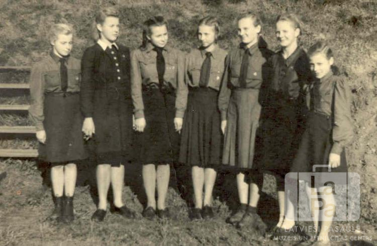 Septiņas Gaujas 35. gaidu vienības gaidas stāv rindā gaidu solījuma došanas dienā Antverpes nometnē Flensburgā (angļu zonā). Iespējams, attēls ir uzņemts 1946. gadā Vīnertas nometnē pie Hūzumas. Lielākā daļa ir ģērbusies formastērpos. Fonā nogāze un koka solu rindas. No kreisās: Zeltīte Lūse, Maija Noriņa, Mudīte Lūse, Līvija Michelsone, Inese Šulca, Valda Sorena un Aija Lūse.