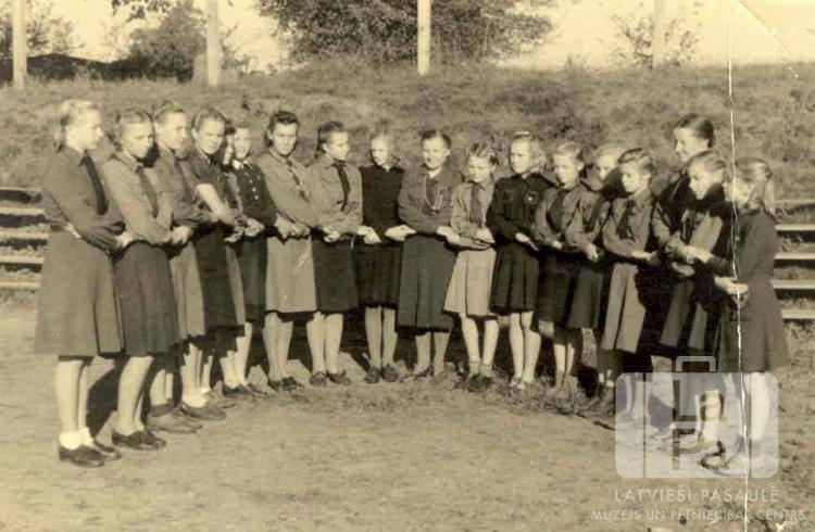 Gaujas 35. gaidu vienības gaidas pēc gaidu solījuma Antverpes nometnē Flensburgā (angļu zonā). Iespējams, attēls ir uzņemts 1946. gadā Vīnertas nometnē pie Hūzumas. Meitenes formastērpos stāv puslokā, sadevušās rokās. Fonā ir neliela nogāze un koka solu rindas.