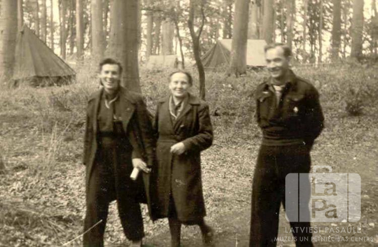 Vadītāji no Antverpes nometnes Flensburgā (angļu zonā) dodas apgaitā "Baden-Powell" nometnes laikā Timmendorfā. Nometne notika no 1948. gada 17. līdz 27. jūlijam. Fonā ir teltis mežā. Pirmā no kreisās: Regīna Pavasare (Gaujas 35. gaidu vienības vadītāja).