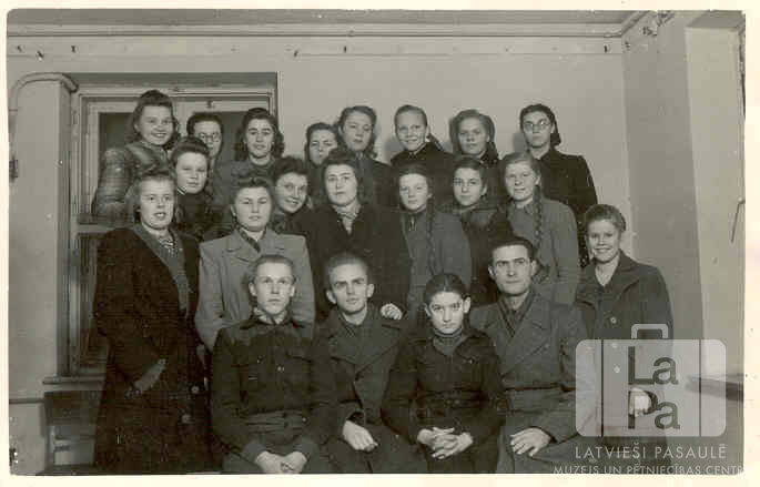 Mārtiņa Ozoliņa kristīgo jauniešu grupa Sengvardenes nometnē (angļu zonā). Jaunieši telpā trijās rindās; pirmā rinda sēž, pārējās divas stāv kājās. Pirmajā rindā, pirmais no labās: Mārtiņš Ozoliņš (vēlāk kļuva par mācītāju). Trešajā rindā, ceturtā no kreisās: Ligita Sproģe (pr. Kalēja).