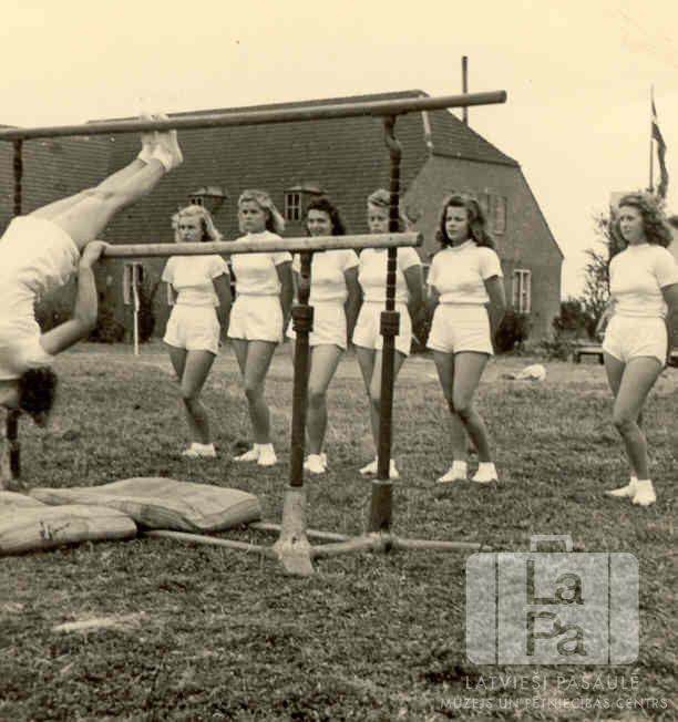 Jaunietes gatavojas sporta svētkiem Sengvardenes nometnē (angļu zonā). Priekšplānā viena jauniete vingro uz vingrošanas stieņiem, aizmugurē sešas jaunietes gaišos sporta tērpos stāv rindā. Fonā ir divstāvu mūra ēka un plīvo karogs. Ierindā stāv, no kreisās: Skaidrīte Karpa, Laimdota ?, Aina Tauriņa (pr. Caune), Austra Tauriņa, Ina Luca un ??.